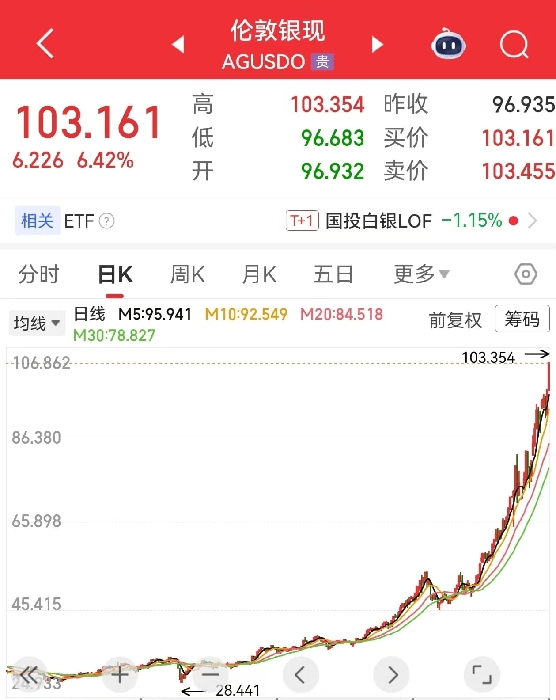 所以是贵金属的超级牛市,市场情绪fomo,优先按情绪定价,最近的大热点就是狂飙的金价银价,白银已经突破百元关口,最高涨到106+。这个涨速太恐怖了,从28到106只用了9个月时间,这一波强趋势的主升浪,敢做空的几乎都被爆仓了,太野蛮,毫不讲理;但又在情理之中。